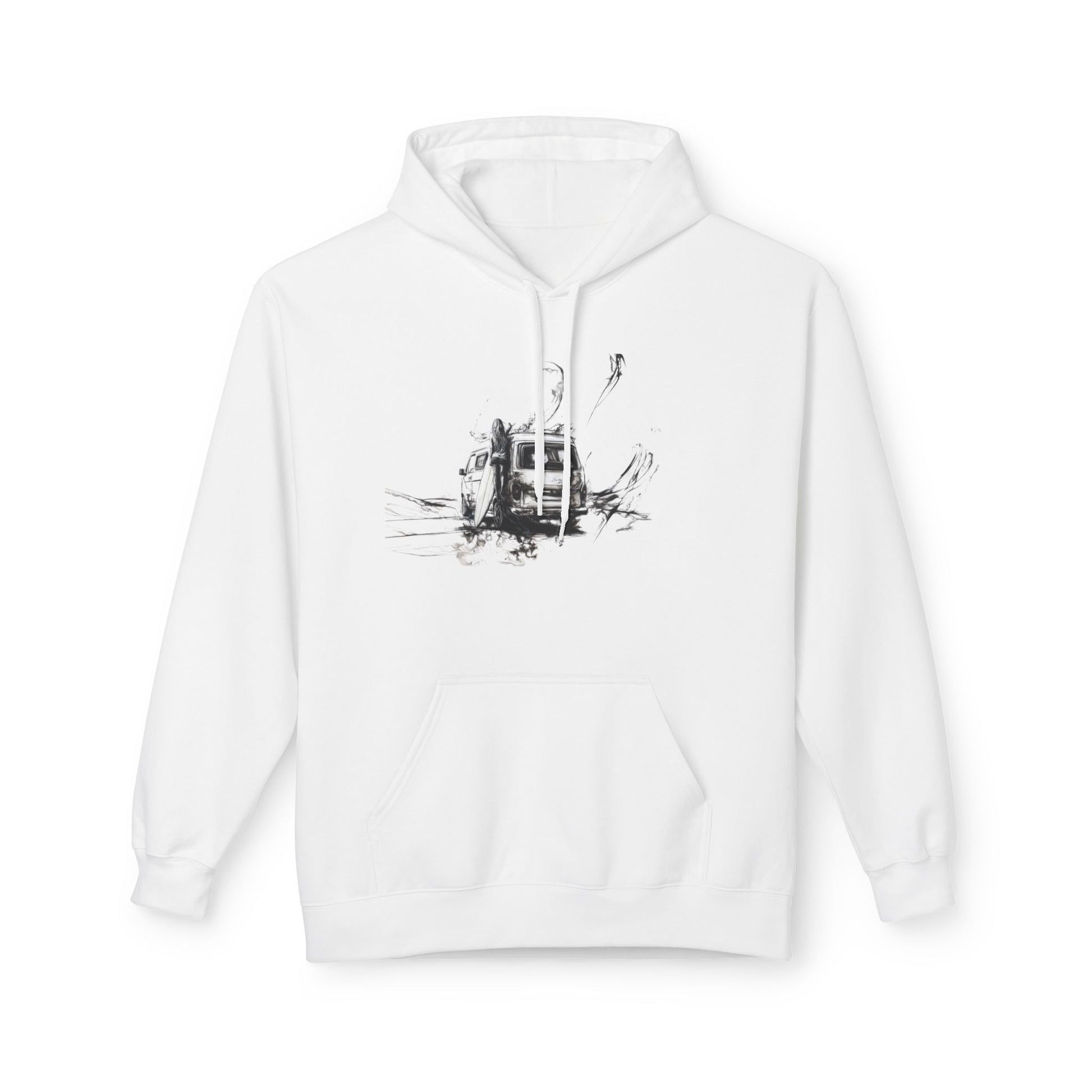 A cozy unisex midweight softstyle fleece hoodie featuring a serene design of a surfer girl alone with her campervan on the beach. This hoodie exudes a laid-back and relaxed vibe, perfect for those who love outdoor adventures and beach life. Ideal for surfers, beach lovers, and anyone who enjoys a casual and comfortable style. Perfect for beach vacations, surfing holidays, and outdoor gatherings.