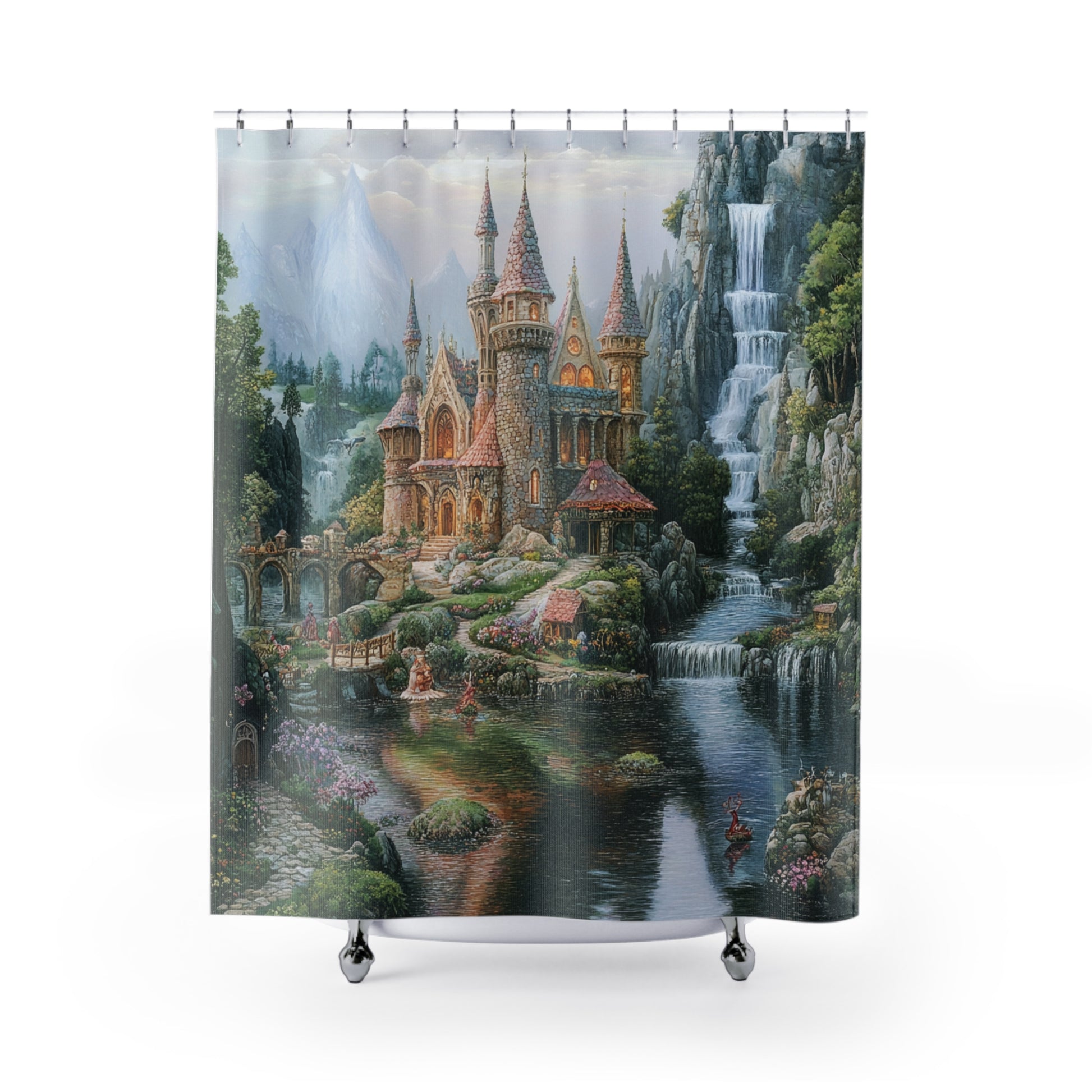 Create an enchanting atmosphere in your kids' bathroom with this enchanted kingdom shower curtain, sparking their imaginations. Perfect for children who love fairy tales and magical adventures. Ideal for decorating bathrooms during birthdays, holidays, or just for everyday whimsy.