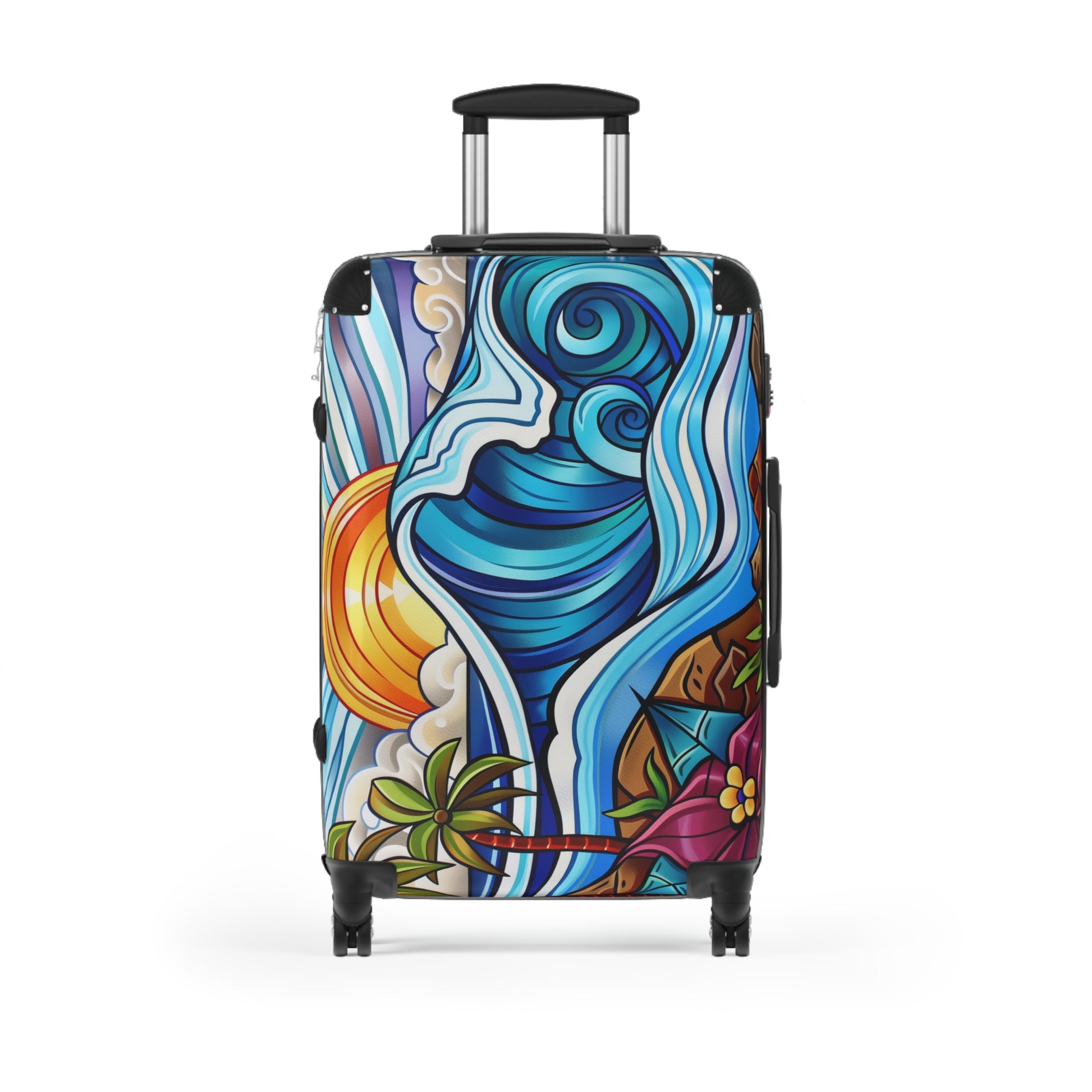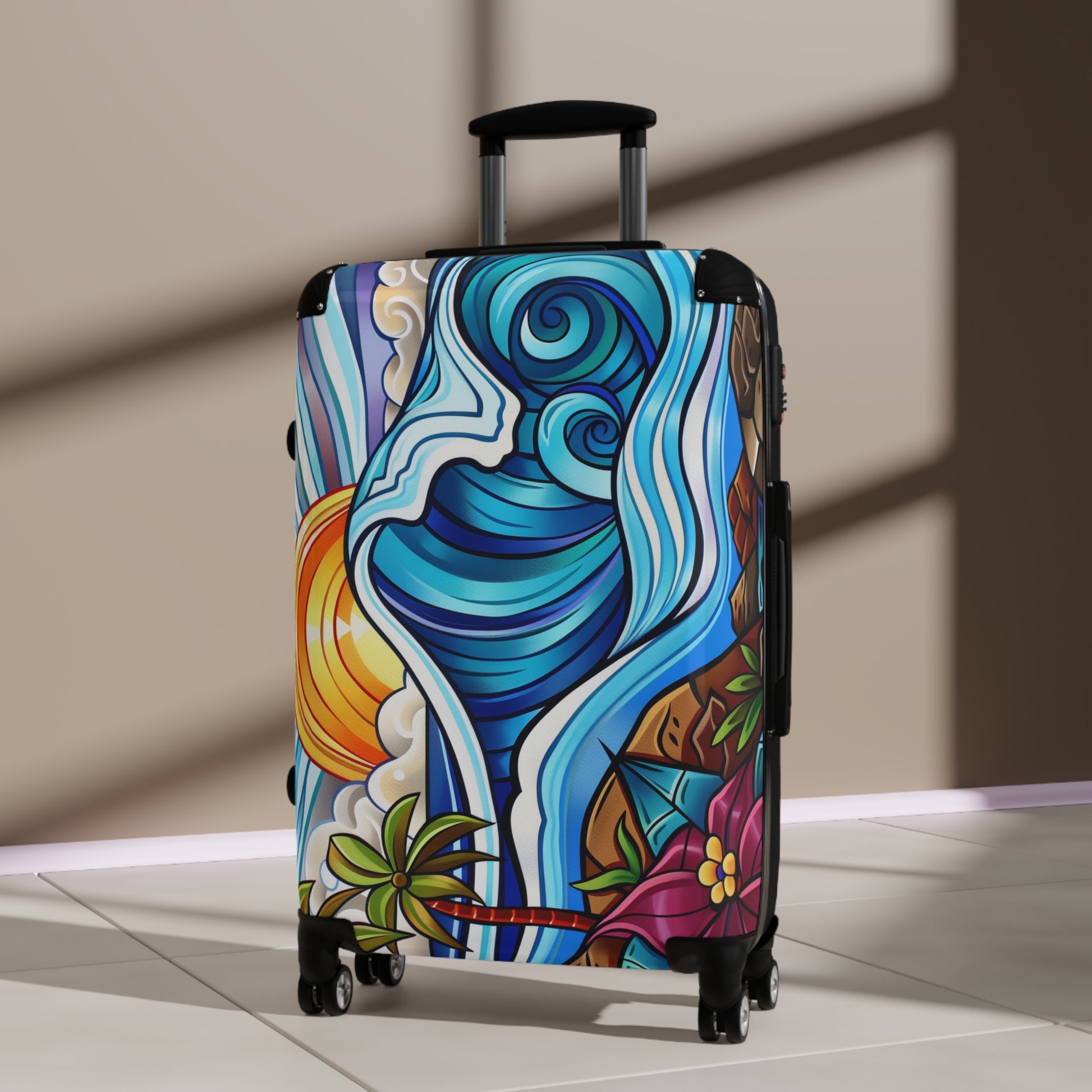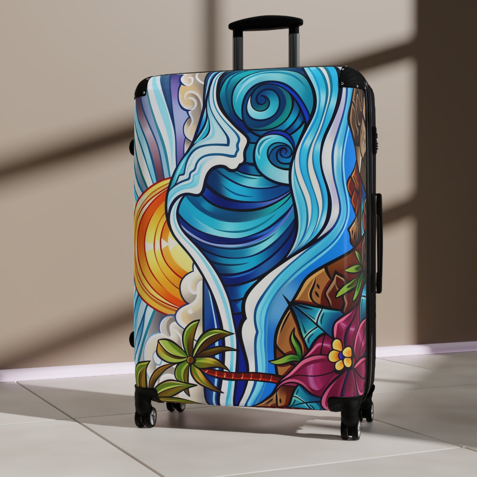This suitcase features a tropical beach sunset design, creating a relaxing and vacation-ready vibe. Perfect for travelers looking to add a touch of paradise to their journeys, this suitcase is ideal for beach lovers and holiday enthusiasts. Whether you're traveling to a tropical destination or simply dreaming of one, this suitcase is a must-have.