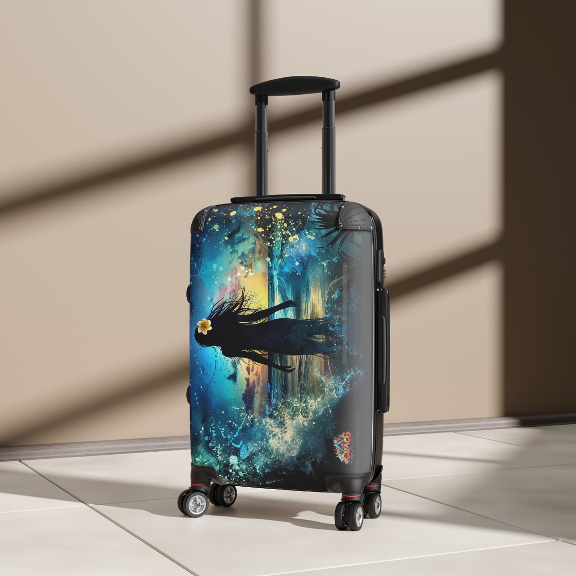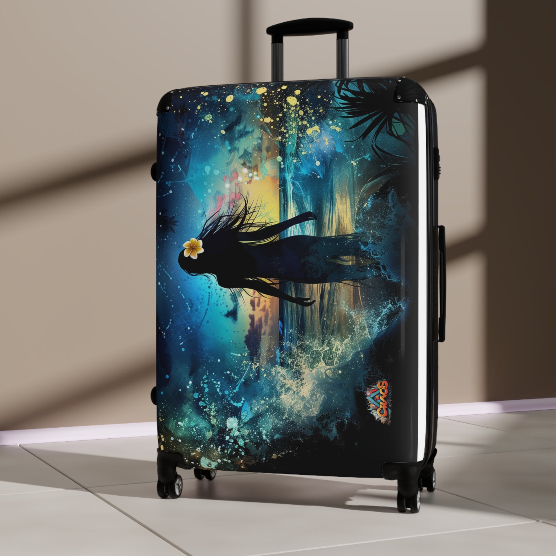 This vibrant Suitcase features a design of a woman in the ocean at sunset, giving off tropical vibes. Perfect for travelers who want to add a touch of paradise to their adventures. Ideal for vacation-goers and beach lovers, relevant for summer holidays and tropical getaways.