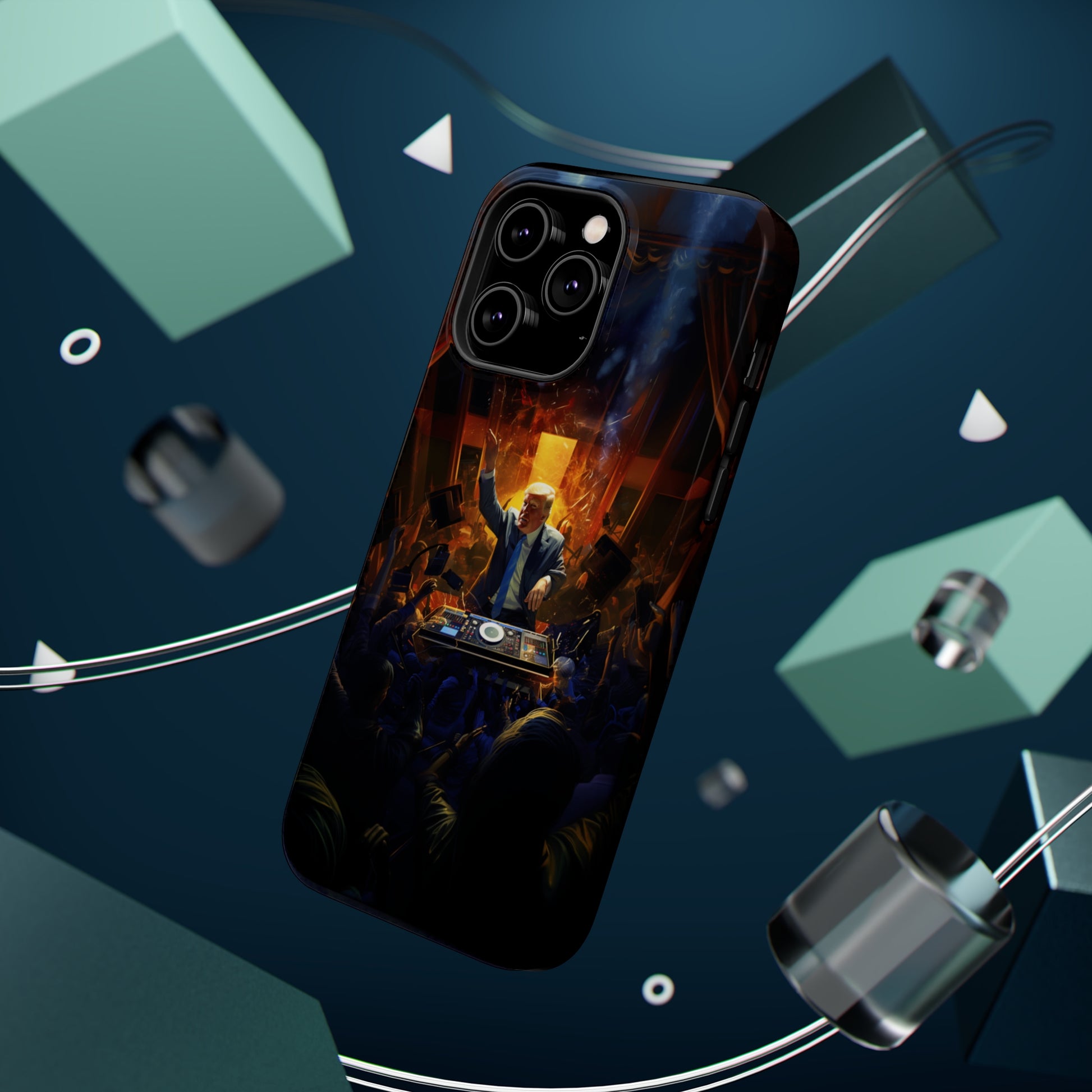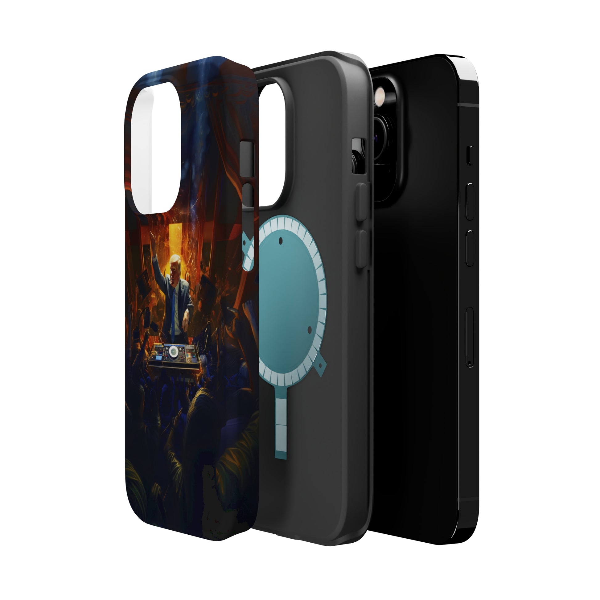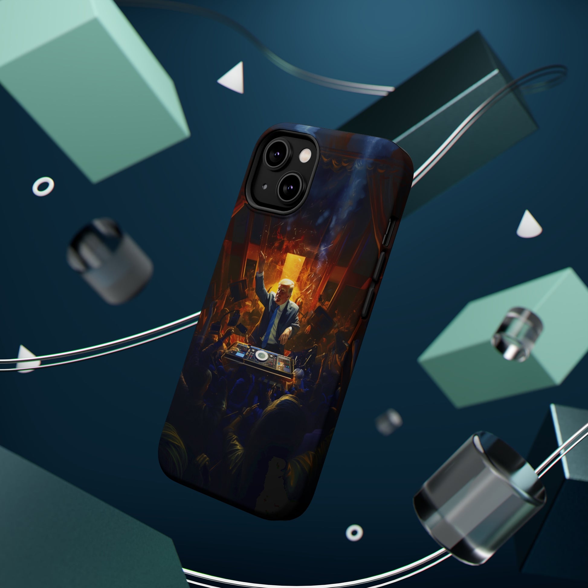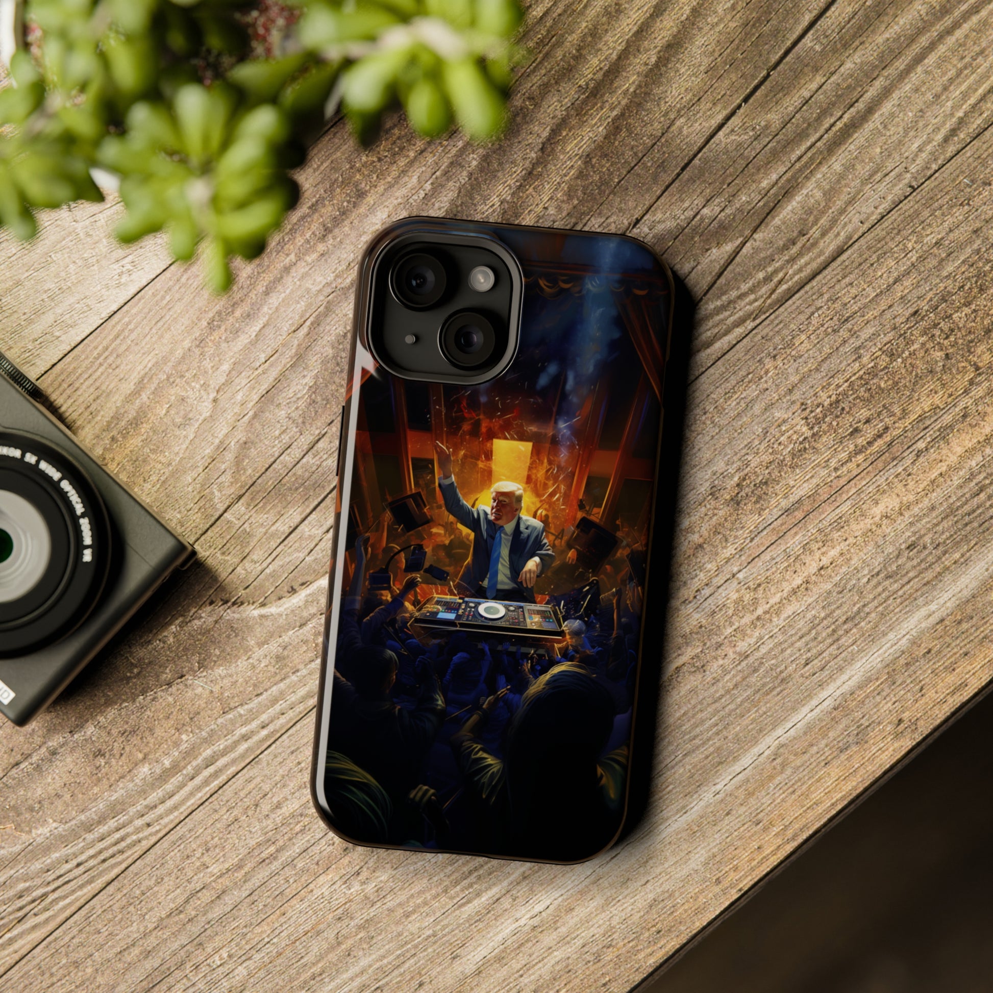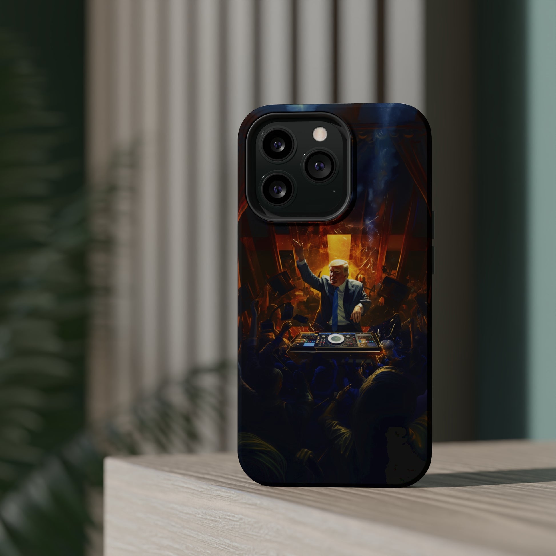 Introducing our bold and irreverent iPhone 15 phone case, where unexpected meets unforgettable! Get ready to make a statement with our unique design featuring none other than Donald Trump, the former president, taking the DJ booth by storm at a vibrant club scene.