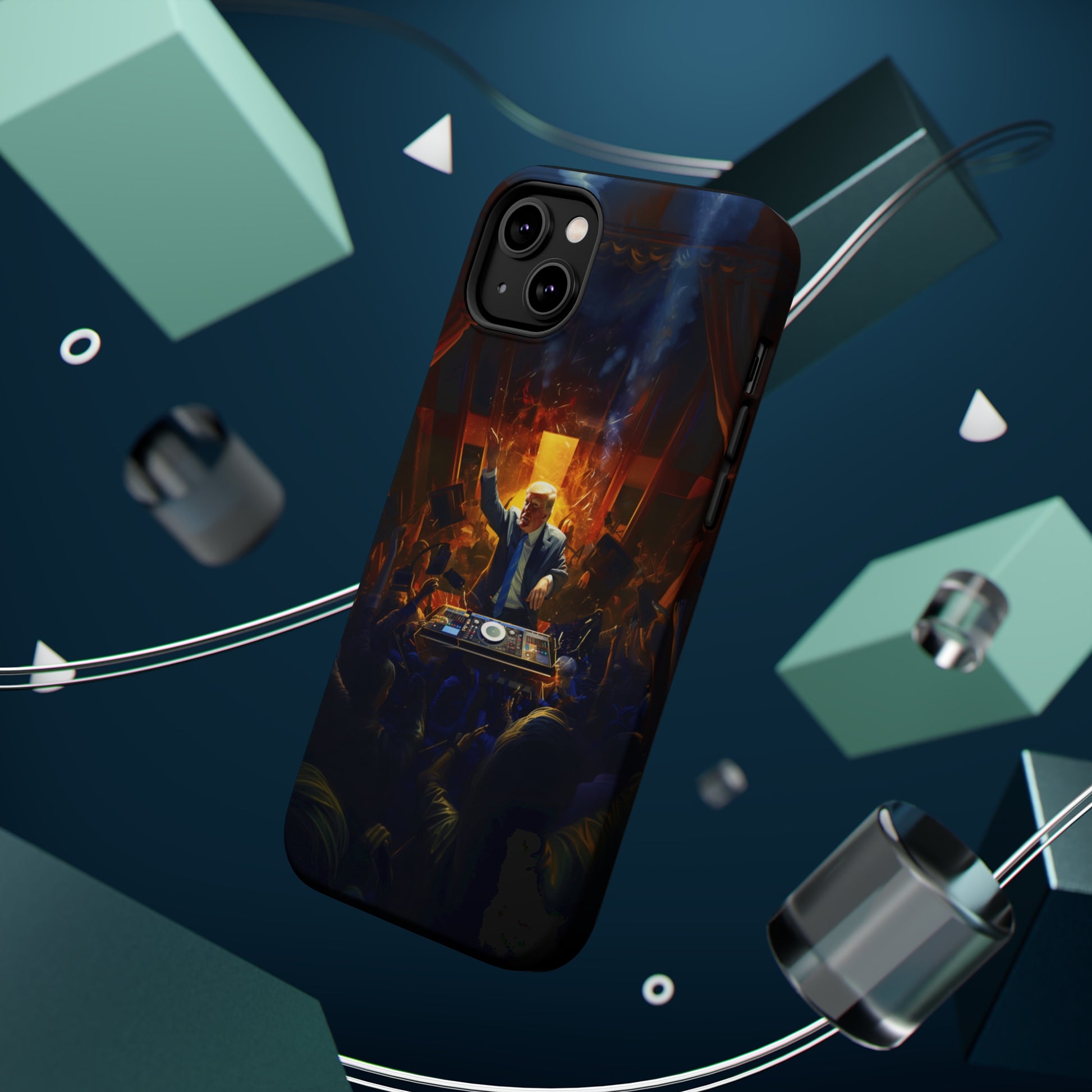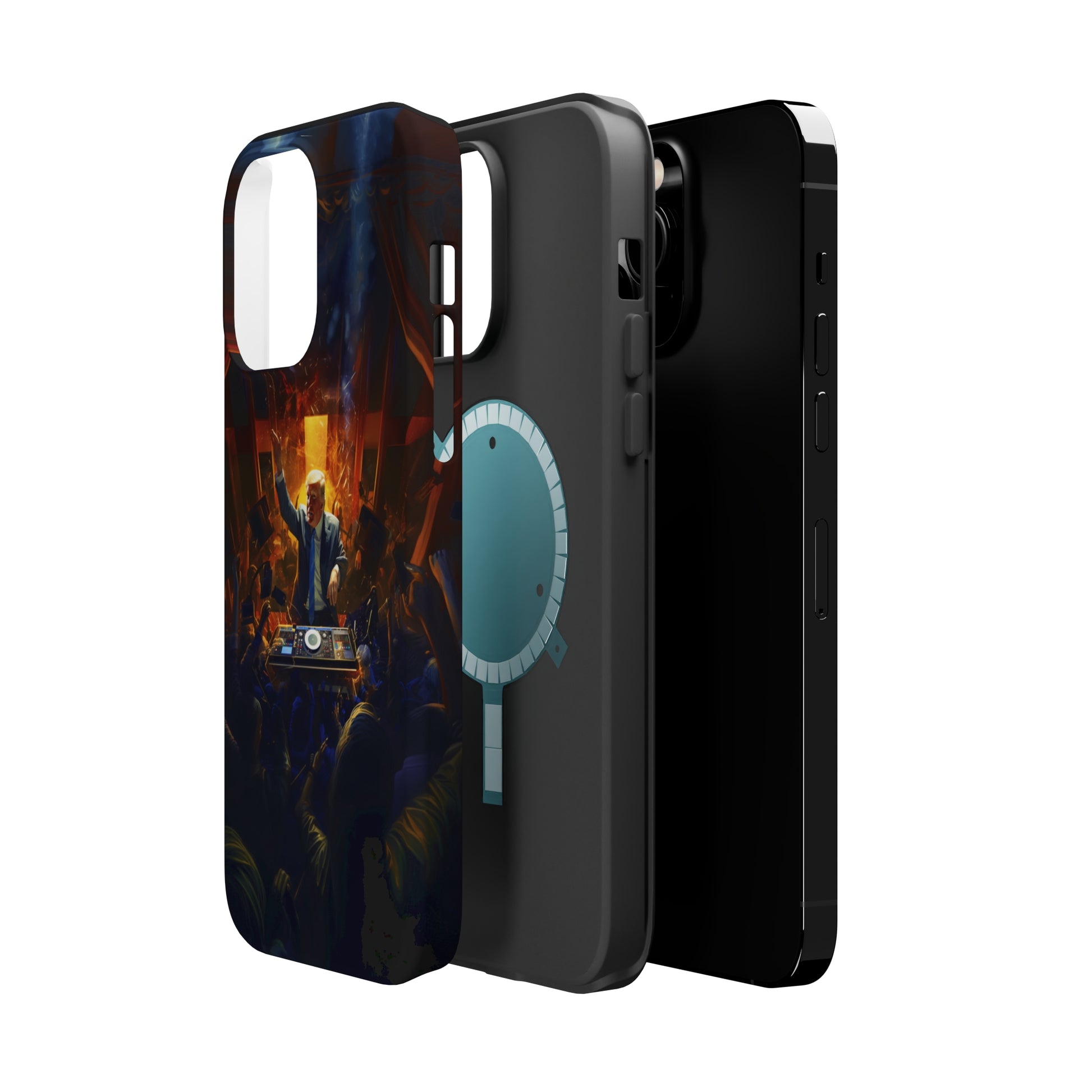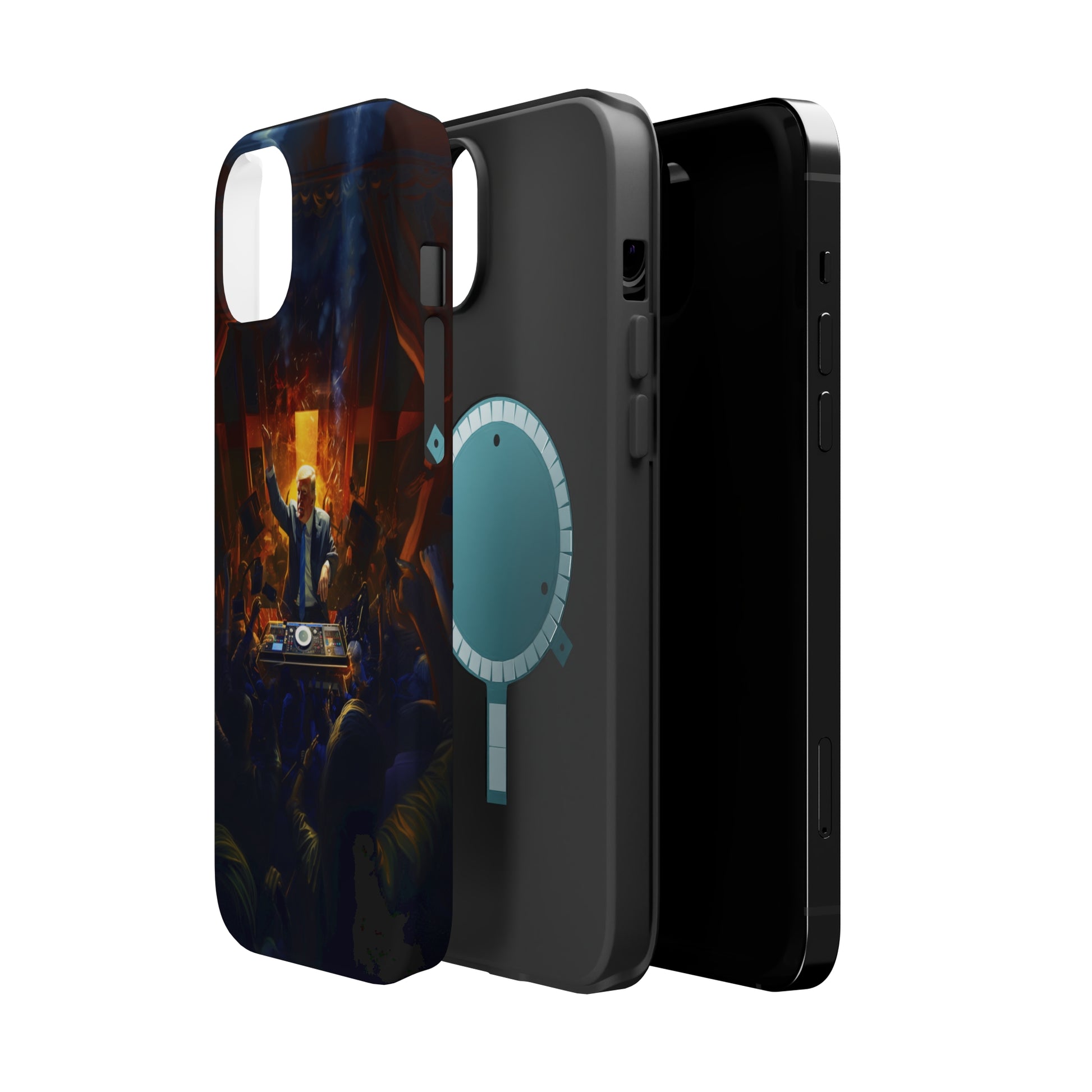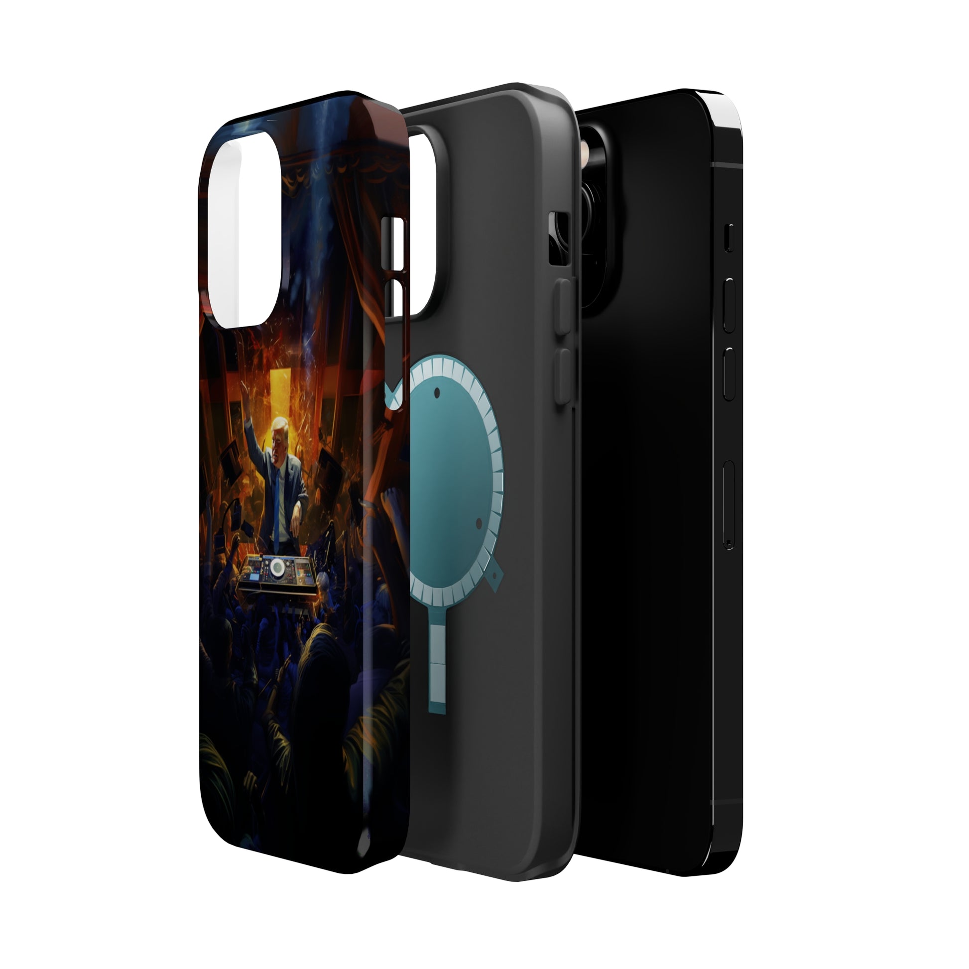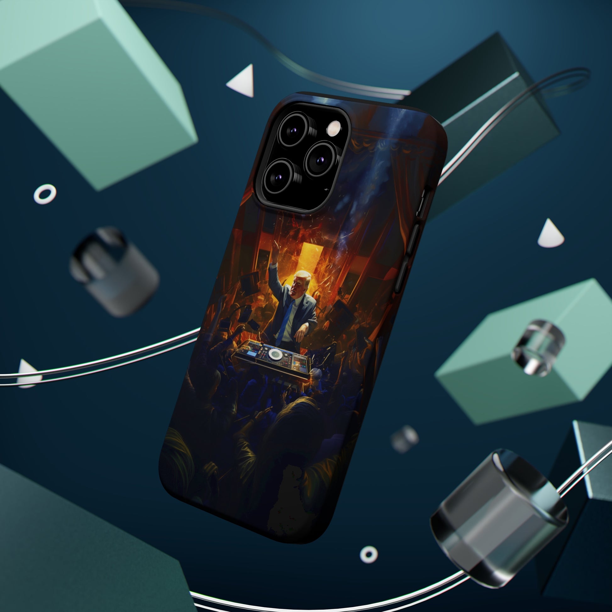 Introducing our bold and irreverent iPhone 15 phone case, where unexpected meets unforgettable! Get ready to make a statement with our unique design featuring none other than Donald Trump, the former president, taking the DJ booth by storm at a vibrant club scene.