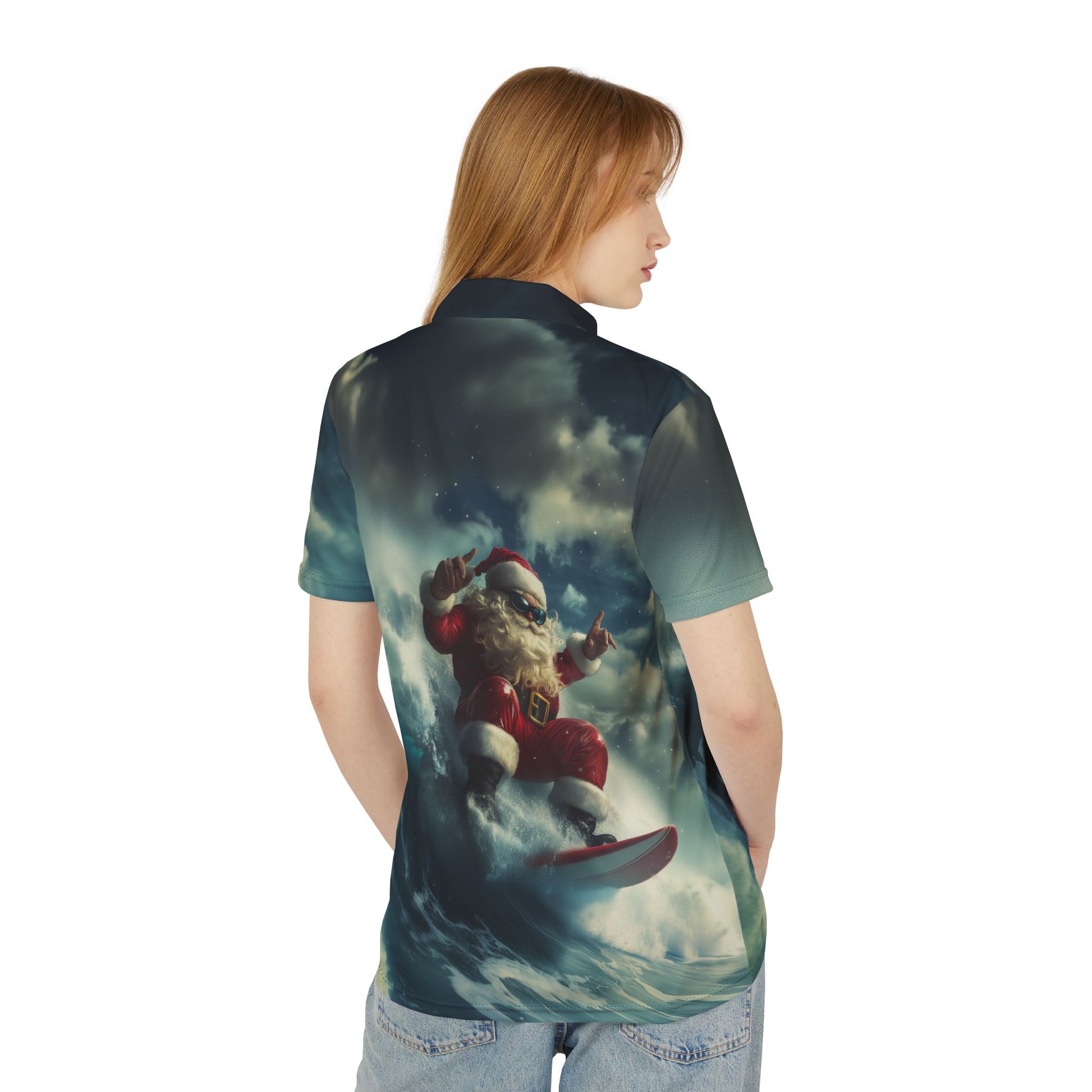 A fun and festive polo shirt featuring Santa surfing like a boss. Perfect for those who love to stand out during the holidays and bring a touch of humor to their wardrobe. Ideal for anyone looking to add a playful twist to their casual attire.