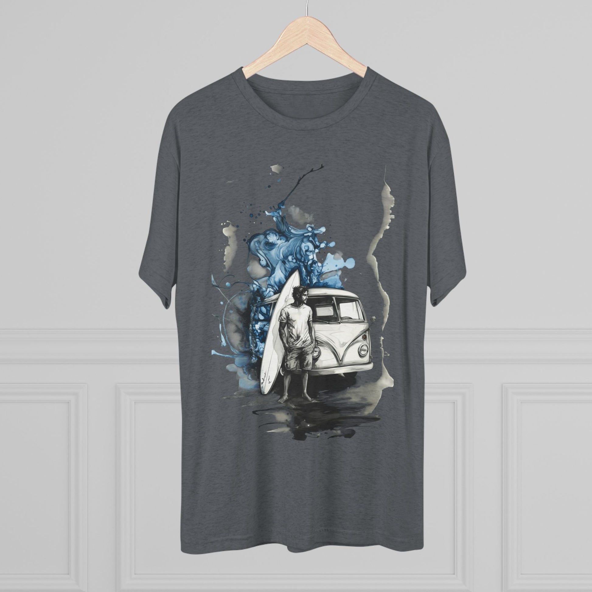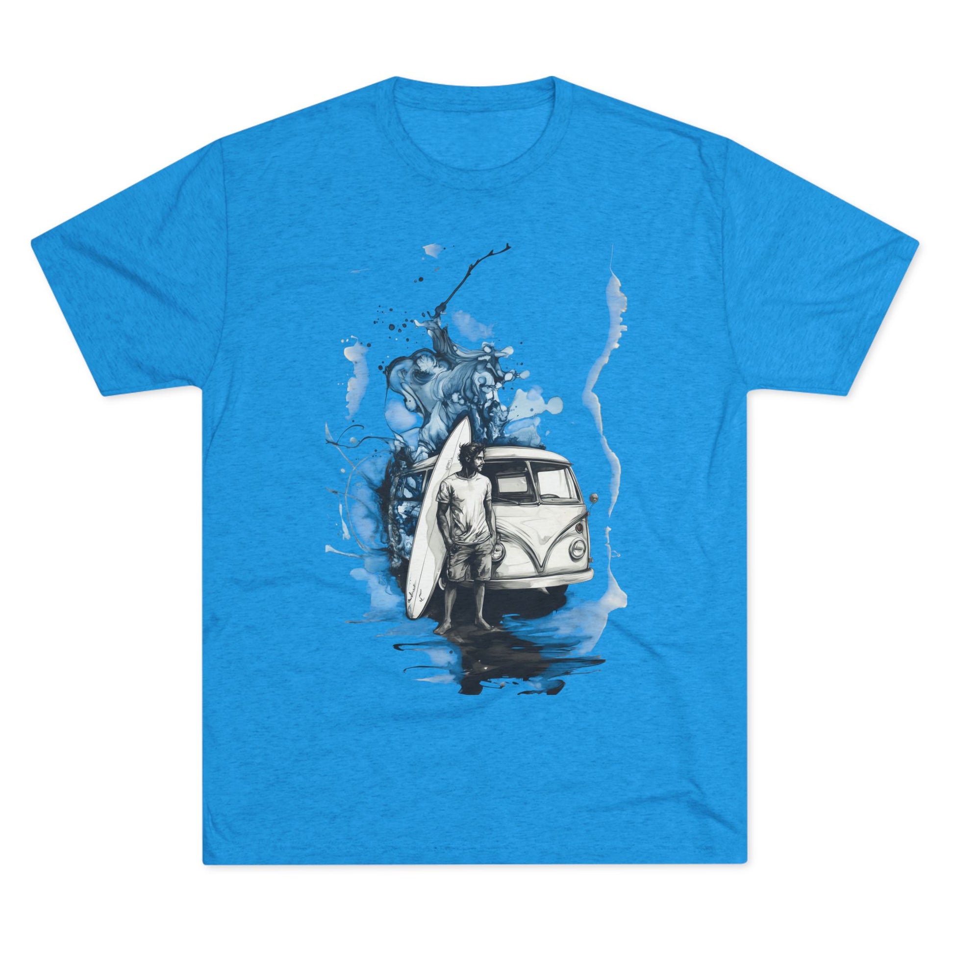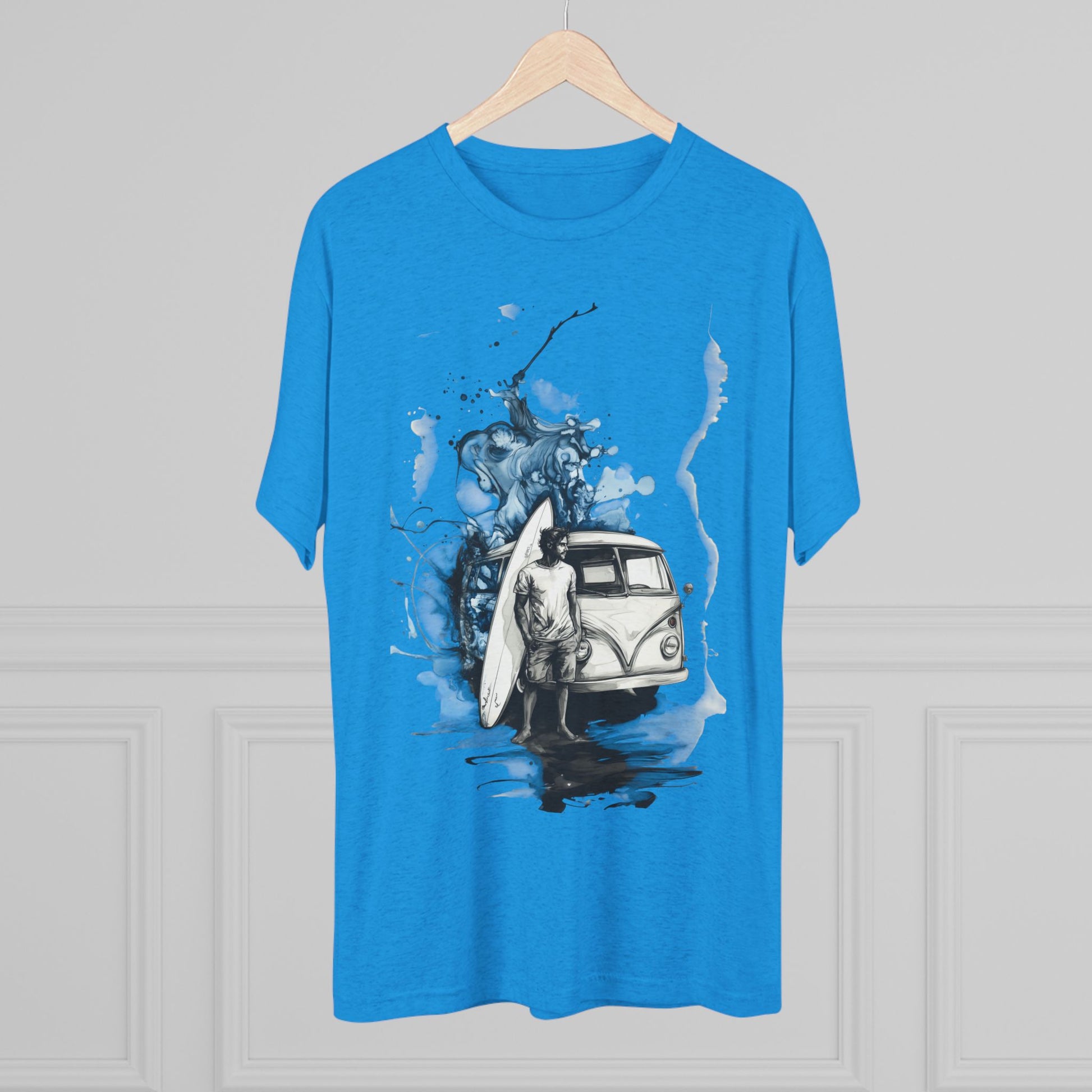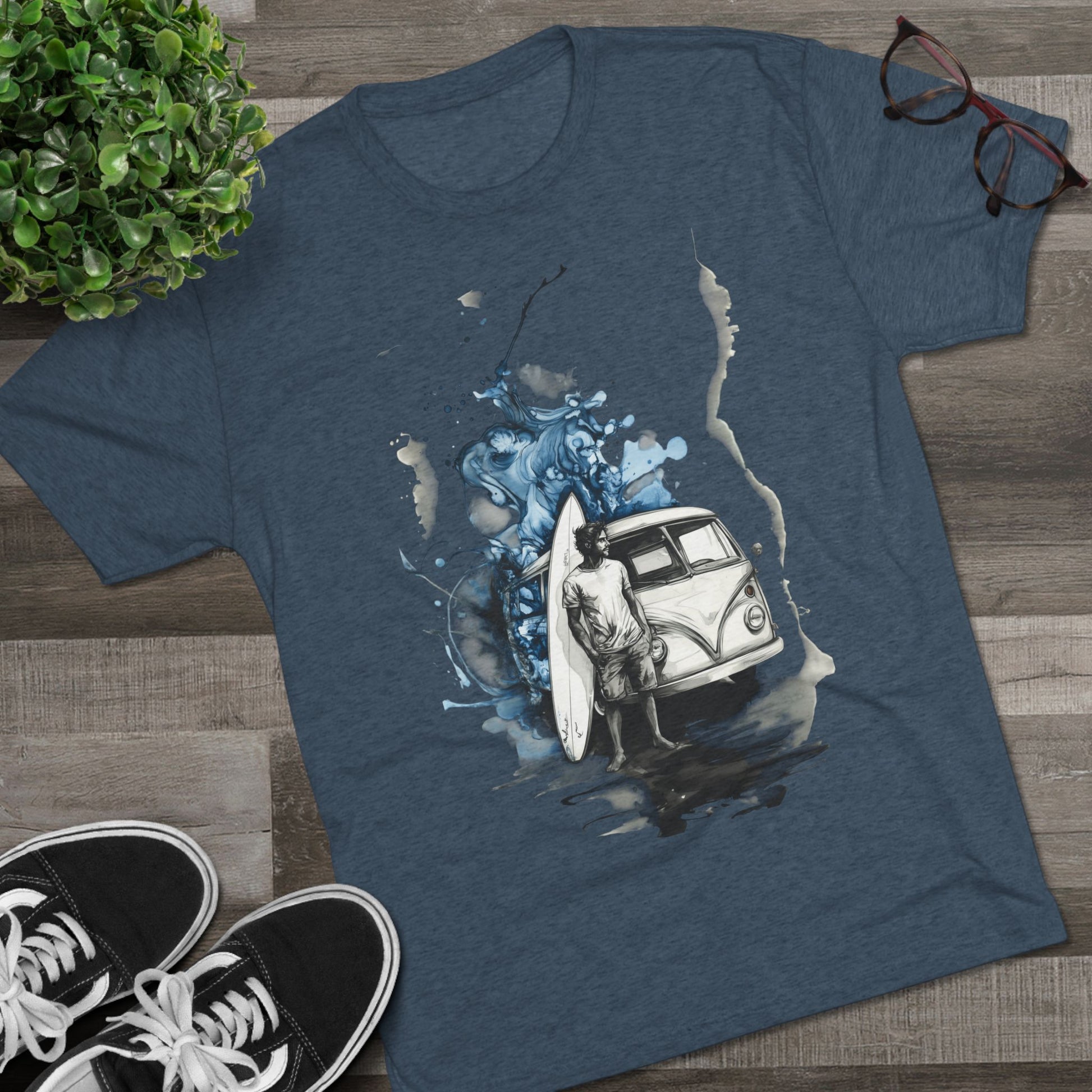 A comfortable and durable T-Shirt featuring a design of a surfer guy with his campervan. Perfect for those who love the beach, surfing, and the outdoor lifestyle. Ideal for casual wear and a great addition to any summer wardrobe. Relevant for beach lovers, surfers, and outdoor enthusiasts. Suitable for summer, beach holidays, and casual occasions.