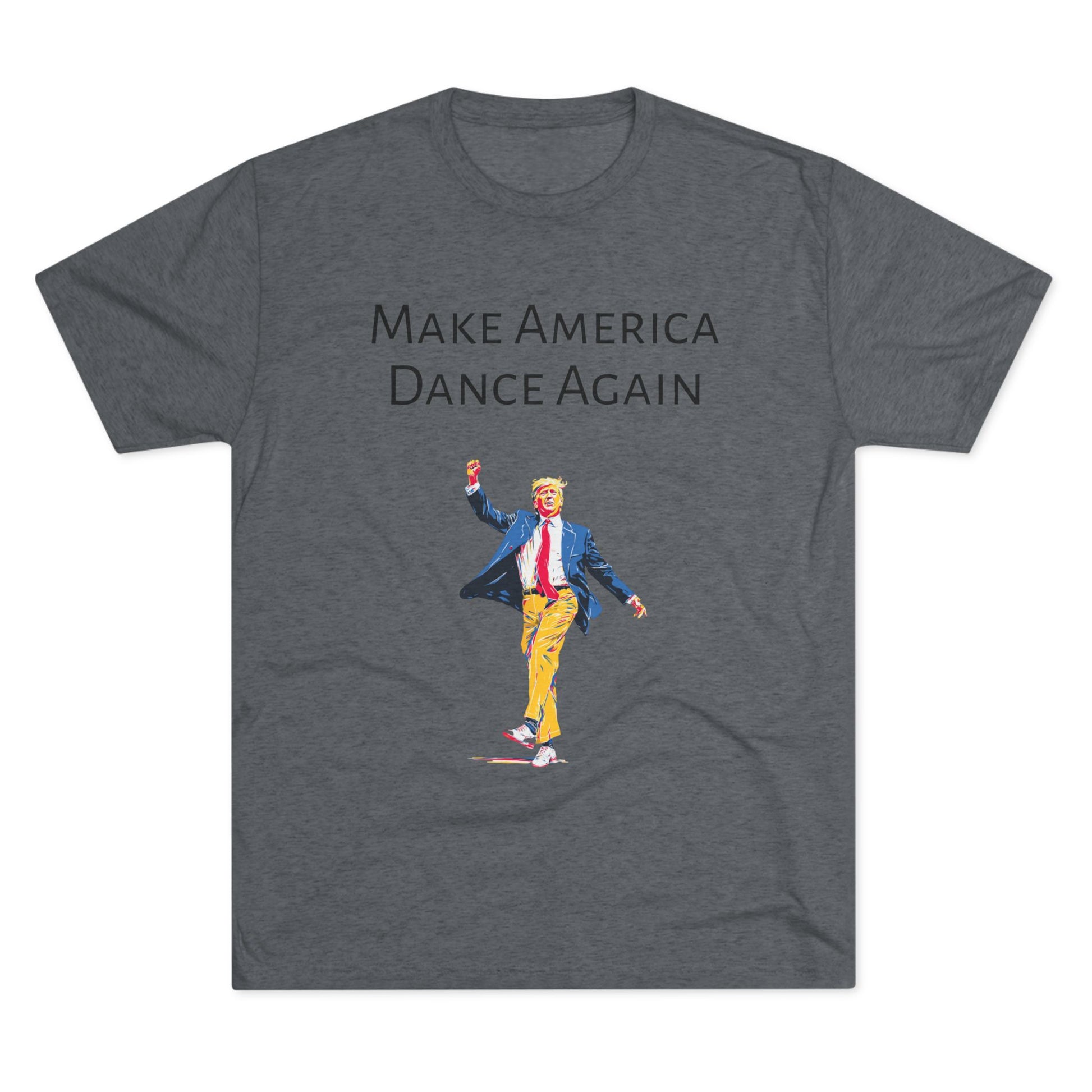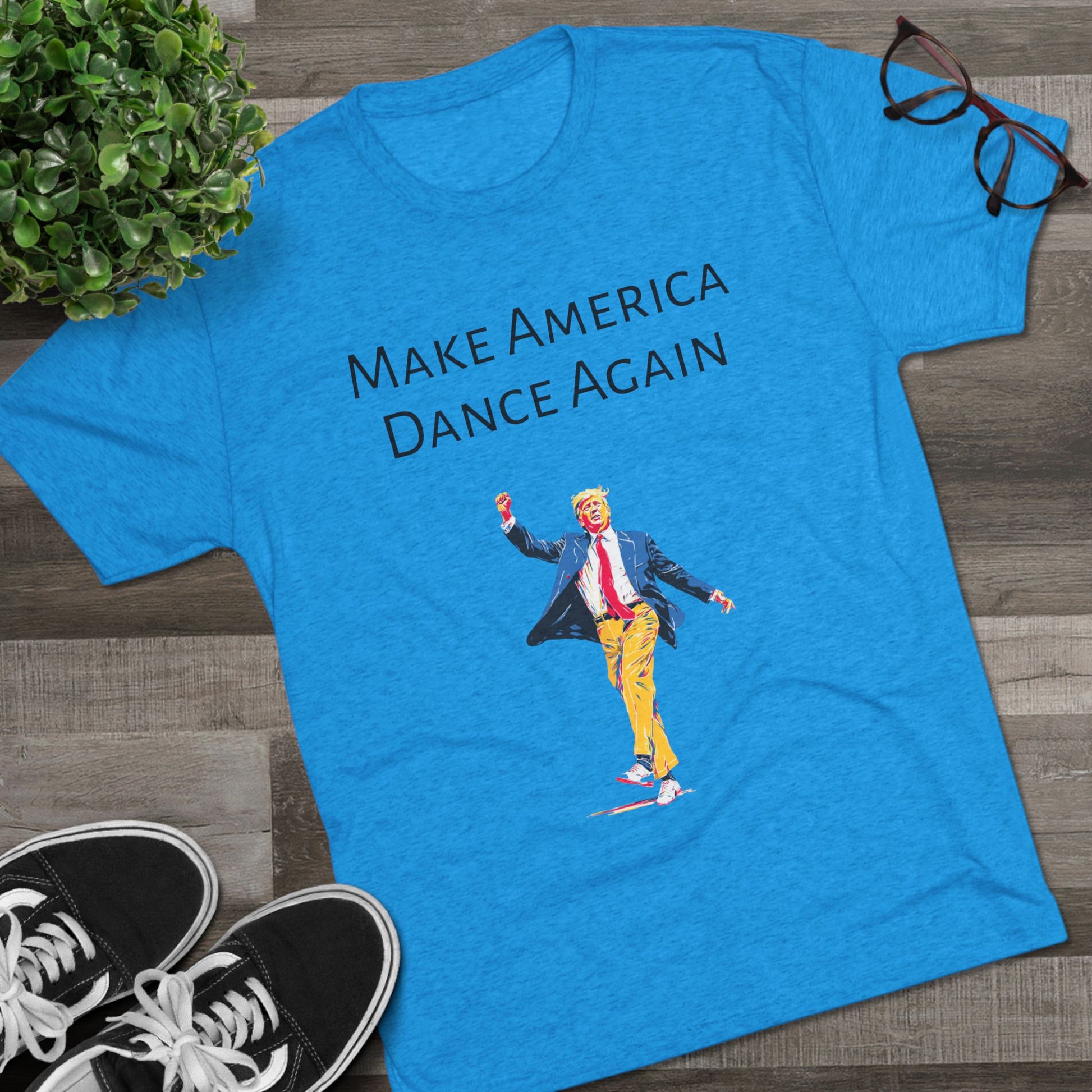 This T-Shirt features a unique design of Trump as a DJ with the slogan 'Make America Dance Again'. It gives off a fun and playful vibe, perfect for music lovers and those with a sense of humor. This tee is relevant for parties, music festivals, and casual wear.